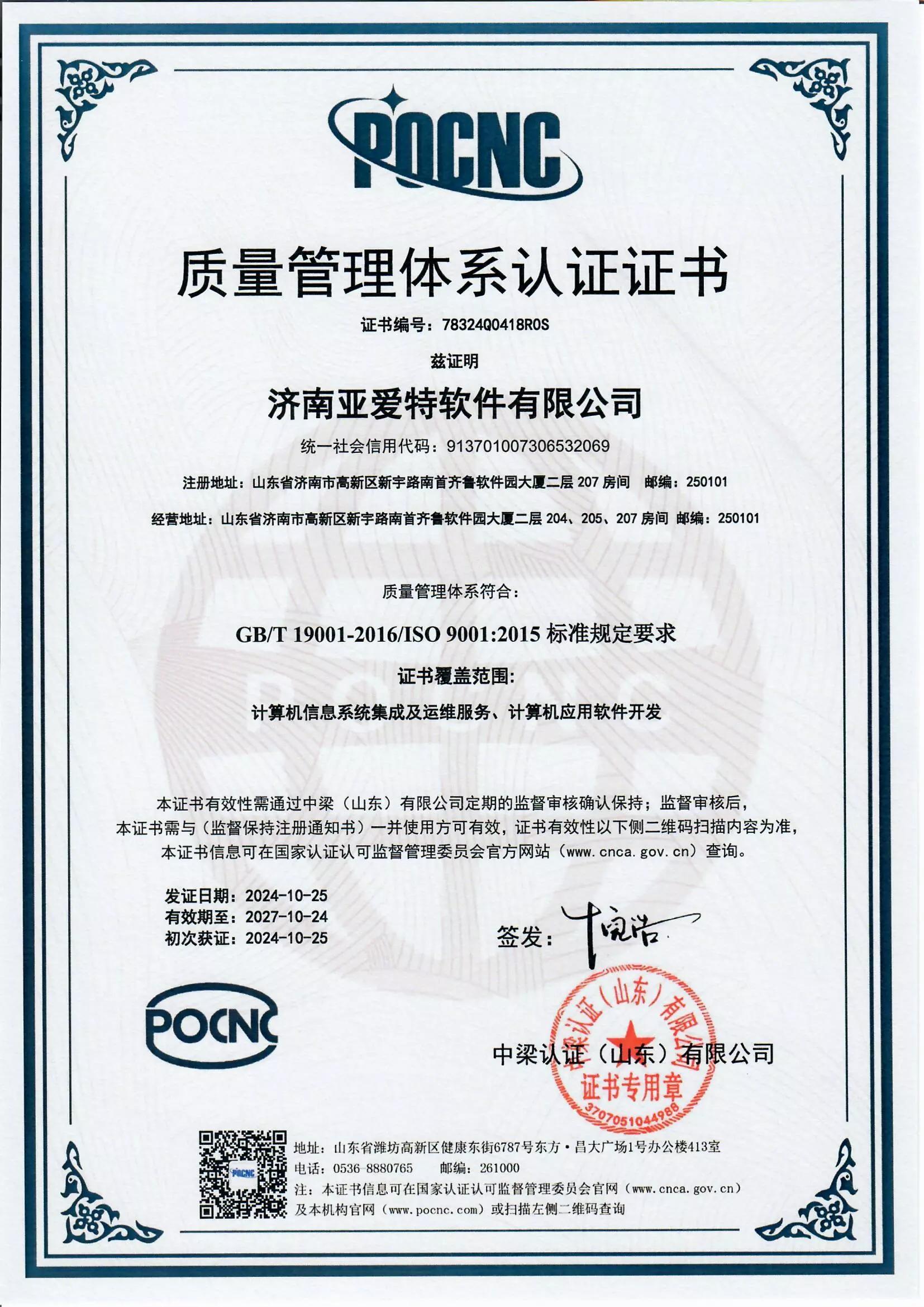 2024年10月25日,亞愛特軟件有限公司正式對(duì)外宣布,公司已成功獲得 ISO 9001 質(zhì)量管理體系認(rèn)證證書。標(biāo)志著公司在質(zhì)量管理領(lǐng)域邁出了具有里程碑意義的重要一步。 ISO 9001 質(zhì)量管理體系認(rèn)證,作為國際公認(rèn)的權(quán)威標(biāo)準(zhǔn),一直以來都是衡量企業(yè)質(zhì)量管理水平的重要標(biāo)尺。該認(rèn)證對(duì)企業(yè)在產(chǎn)品質(zhì)量管控、服務(wù)流程優(yōu)化以及內(nèi)部管理提升等多方面均提出了嚴(yán)格要求。此次濟(jì)南亞愛特軟件有限公司 成功通過認(rèn)證,充分證明了公司在質(zhì)量管理方面已經(jīng)達(dá)到國際先進(jìn)水平。 獲得該認(rèn)證后,亞愛特軟件有限公司在市場競爭中的優(yōu)勢將進(jìn)一步凸顯。一方面,國際標(biāo)準(zhǔn)的質(zhì)量管理體系將極大增強(qiáng)客戶對(duì)公司產(chǎn)品和服務(wù)的信任度,為公司開拓國內(nèi)外市場提供有力支撐;另一方面,通過認(rèn)證所帶來的品牌效應(yīng),也將吸引更多優(yōu)質(zhì)合作伙伴,為公司業(yè)務(wù)拓展創(chuàng)造更廣闊的空間。 為了順利通過此次認(rèn)證,亞愛特軟件有限公司全體員工齊心協(xié)力,歷經(jīng)數(shù)月籌備。認(rèn)證籌備小組精心梳理公司內(nèi)部體系文件,對(duì)現(xiàn)有業(yè)務(wù)流程進(jìn)行深度優(yōu)化,并針對(duì)審核環(huán)節(jié)做了充分準(zhǔn)備。在此過程中,公司各部門緊密配合,在日常工作中始終堅(jiān)持嚴(yán)格的質(zhì)量把控,積極推動(dòng)質(zhì)量管理體系的持續(xù)改進(jìn)。 隨著 濟(jì)南亞愛特軟件有限公司成功獲得 ISO 9001 質(zhì)量管理體系認(rèn)證證書,相信在全體員工的共同努力下,公司必將在未來的發(fā)展道路上續(xù)寫新的輝煌篇章。