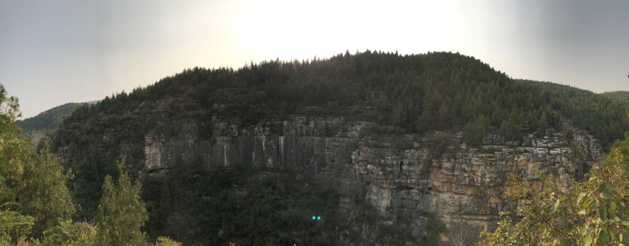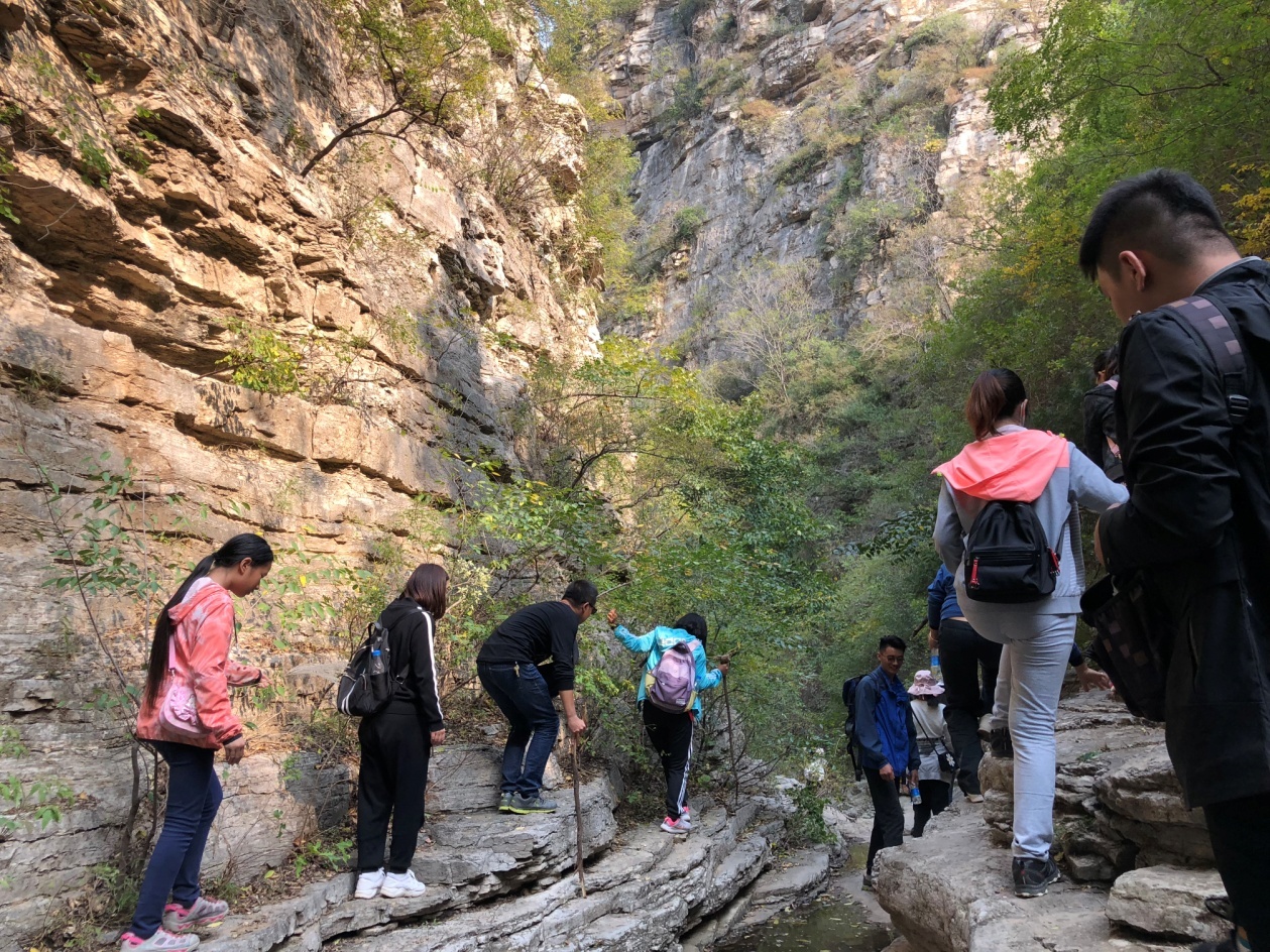 小憩完畢,又開(kāi)始了新的行程,也是徒步之行最美的風(fēng)景了。走過(guò)蘆葦叢,沿著雜草叢生的小路,一路往下來(lái)到了藏龍澗,雖然兩側(cè)危峰壁立,陡峭如削,但因陽(yáng)光的攝入,映出一片溫暖的金黃,經(jīng)過(guò)山澗的長(zhǎng)途拔涉,大家齊心協(xié)力,手腳并用,穿過(guò)”一線天”終于到了風(fēng)景臺(tái)。眺望遠(yuǎn)方,層巒疊障,懸崖峭壁間倔強(qiáng)的小樹(shù),遠(yuǎn)處的報(bào)恩塔靜靜地矗立在險(xiǎn)峰之間,感嘆大自然的鬼斧神工!